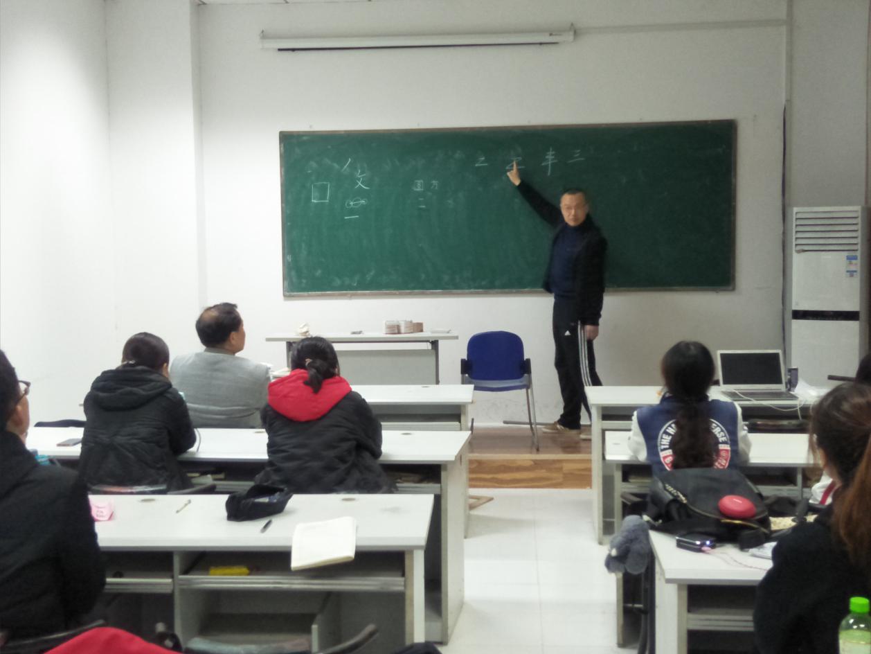 马老师首先向同学们介绍了粉笔字三指执笔的基本方法并亲自板书示范。他指出,在前的食指应距离粉笔头1.5公分左右,不能太远或太近;笔杆应指向掌心,不能太上,也不能指向虎口;每个字的大小应在8-10公分;单个字的书写讲究结构匀称、重心平稳,不要刻意追求横平竖直,竖写的字要立得起来,应倾斜5-7度,而不是贴在黑板上。