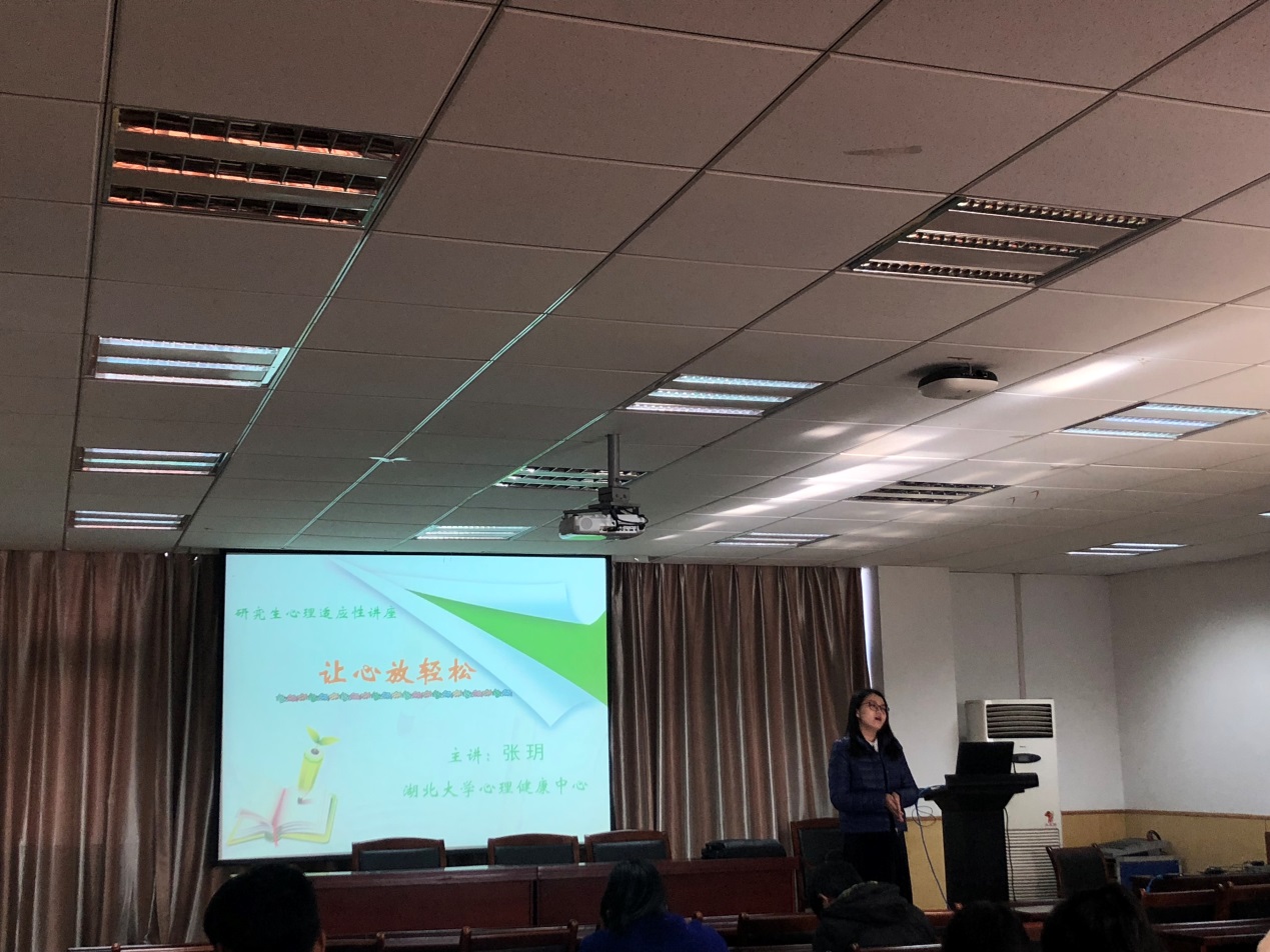 11月23日下午,在数统院201报告厅举行了研究生心理健康讲座,本次讲座由365英国上市公司心理健康中心的张玥老师主讲,主题为“让心放轻松”。