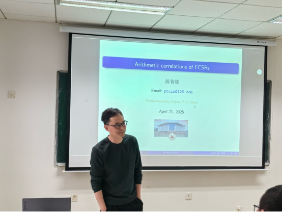 2025年4月21日上午,莆田学院陈智雄教授应邀来访我院,并于我院院203报告厅作了题为《Arithmetic correlations of FCSRs》的学术报告。