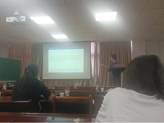 江西师范大学李红海教授的报告题目是《A signless Laplacian spectral Erdös-Stone-Simonovits theorem》。李红海教授首先向大家介绍了图的无符号Laplacian谱相关的概念以及研究背景,Erdös-Stone-Simonovits 定理相关问题的研究进展,并向大家介绍了他们团队的最新研究成果。最后,与本团队教师就图的谱极值问题进行了探讨,给接下来本团队的研究工作提供了新思路。李红海教授讲解得十分详细,思维严谨,极大鼓舞了青年教师和学生们的学术热情,给大家带来了很多启示。