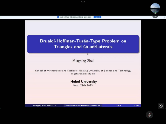 20251127日,南京理工大学翟明清老师应我院刘慧清教授邀请,为我院师生作线上学术报告,报告通过腾讯会议在线举行。会议由刘慧清教授主持,来自运筹学与控制论专业的教师、博士和硕士研究生参与了报告的听取、讨论。
