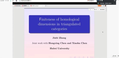 报告伊始,张教授系统回顾了三角范畴维数理论的研究进展,重点介绍了三角范畴的有限维数与整体维数等基本概念。随后,他结合自身研究工作,深入浅出地阐述了这两类维数在“粘合”操作下的性质与表现。在报告最后部分,张教授分享了该领域的最新研究思路与阶段性成果,为在场师生提供了重要的学术参考。