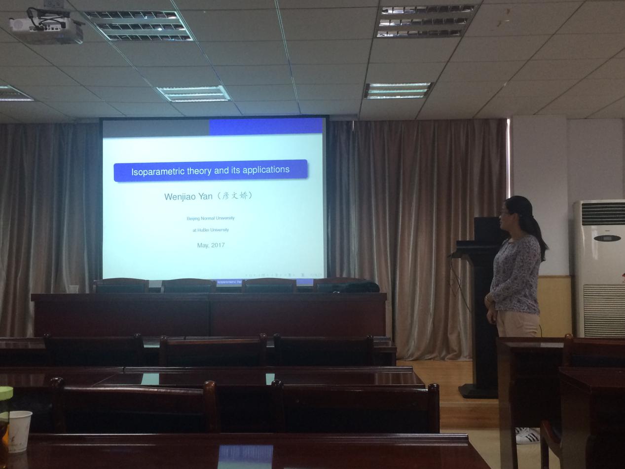 5月27日下午,北京师范大学彦文娇副教授来我院访问。她在学院201学术报告厅为师生作了题为”Isoparametric theory and its application”的报告。
