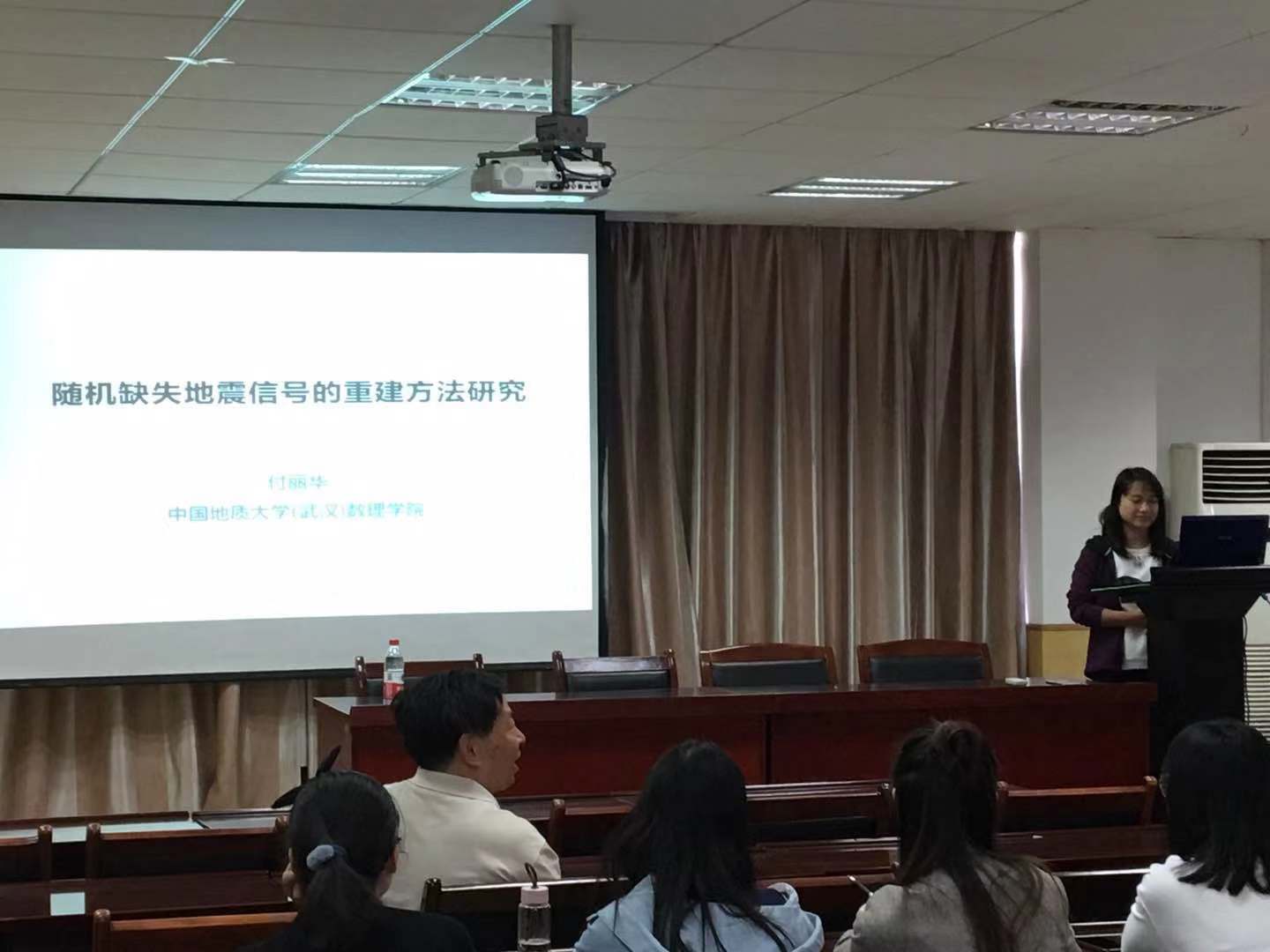 付丽华教授的报告谈到了低秩约束下随机缺失地震数据重建的方法。其精彩的内容引起了在场师生的极大兴趣。报告结束后,付教授与在场的师生对于报告的内容进行的深入的讨论交流,大家都表示获益匪浅。