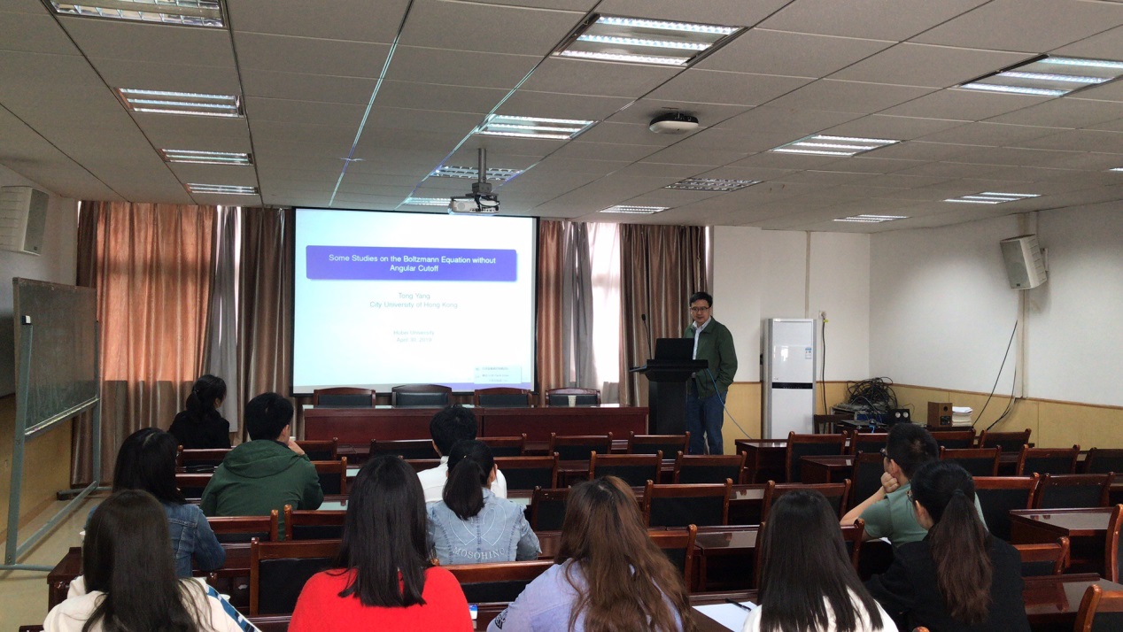 2019年4月30日上午,香港城市大学杨彤教授应邀来访我院,并为相关专业的教师与研究生做了题为“Some studies on the Boltzmann equation without angular cutoff”的学术报告。
