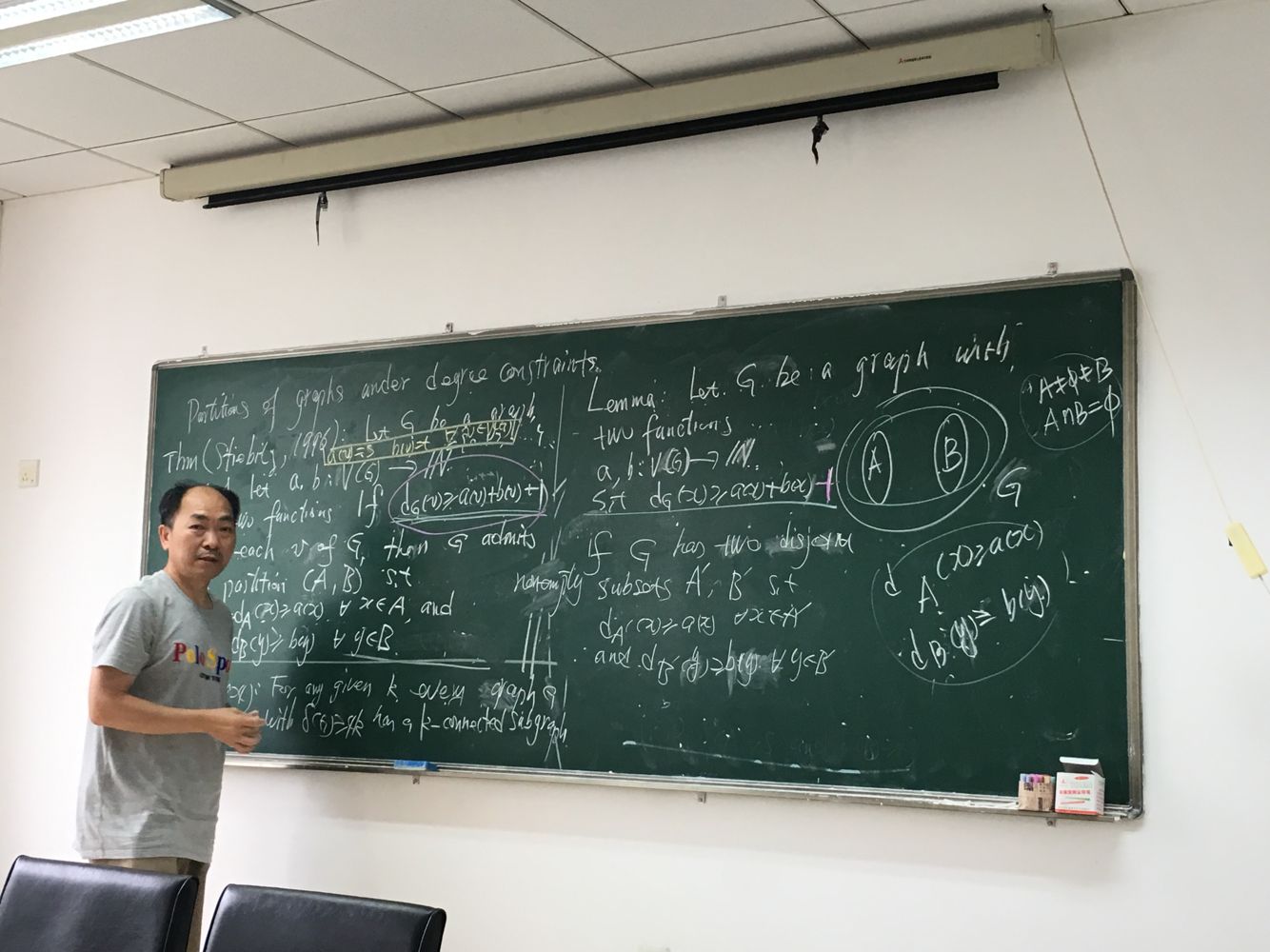 该问题起源于1996年,Stirbitz证实了Thomassen的一个猜想,并证明了对任意非负整数s和t,和任意一个图G,只要该图的最小度大于等于s+t+1,则G必定包含一个二分集S和T,满足:S的生成子图的最小度大于等于s,T的生成子图的最小度大于等于t。最近,Schweser和Stiebitz考虑了重图的类似问题,并将一些结论从简单图推广到重图。在此次报告中,许教授介绍了一些关于这一主题的最新进展和尚未解决的问题。报告结束后,许教授就在座教师们提出的问题给予了耐心的解答。报告会,极大鼓舞了青年教师们学术热情,使大家受益匪浅。