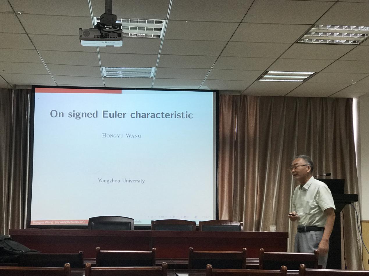 2019年6月9日下午,扬州大学王宏玉教授应邀来访我院,并为相关专业的教师与研究生做了题为“On Singed Euler Characteristic”的学术报告。