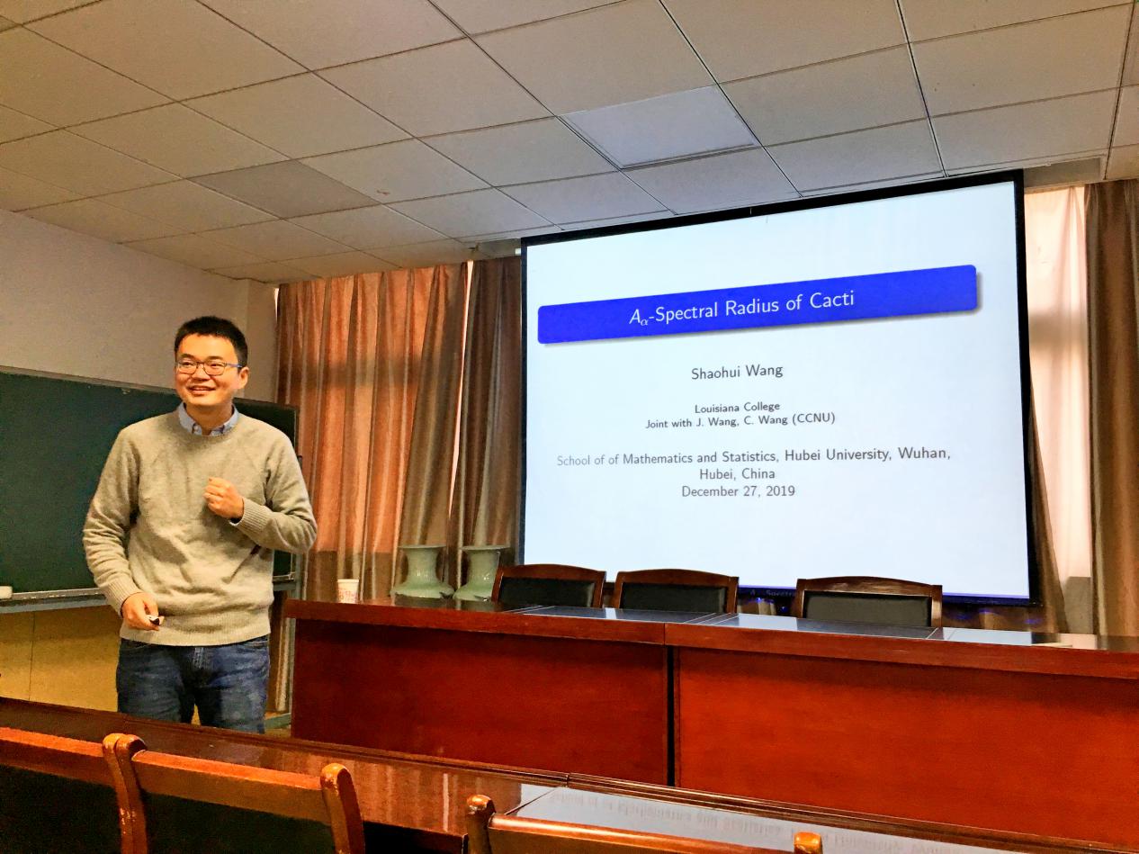 12月27日,路易斯安娜学院王绍辉教授,在院201报告厅为学院师生做了题为“Aα-Spectral Radius of Cacti”的学术报告,报告由学院的赵芹老师主持。来自运筹学与控制论专业的教师、博士和硕士研究生参加了本次学术报告。