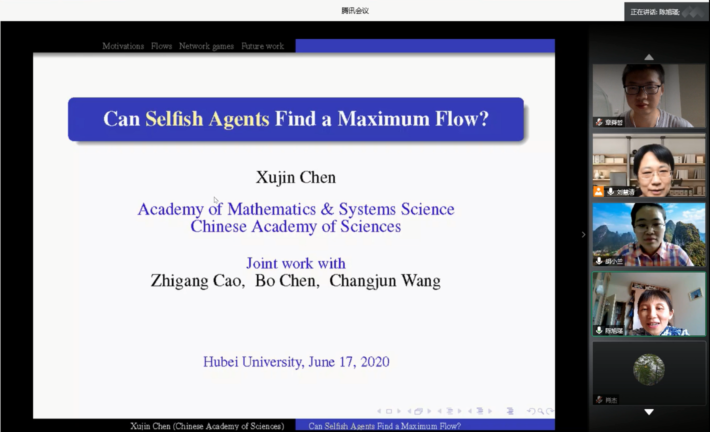 2020年6月17日下午, 中科院数学与系统科学研究院陈旭瑾研究员应我院刘慧清教授邀请,为我院师生作线上学术报告,报告通过腾讯会议在线举行。会议由刘慧清教授主持,来自运筹学与控制论专业的教师、博士和硕士研究生13人参与了报告的听取、讨论。