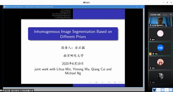 金正猛教授报告题目为《Inhomogeneous Image Segmentation Based on Different Priors》,报告介绍了两种基于不同先验用于图像分割的变分模型,证明变分模型极小值的存在性。在此基础上,给出一种有效的数值求解算法,并展示了其实验结果验证所提方法的有效性。