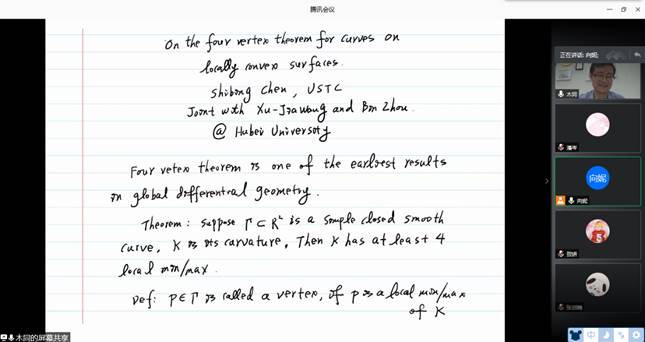 陈世炳教授报告题目为《On the four vertex theorem for curves on locally convex surfaces》,报告介绍了局部凸曲面上曲线的经典四顶点定理,利用齐次Monge-Ampere方程讨论该定理的证明思路。