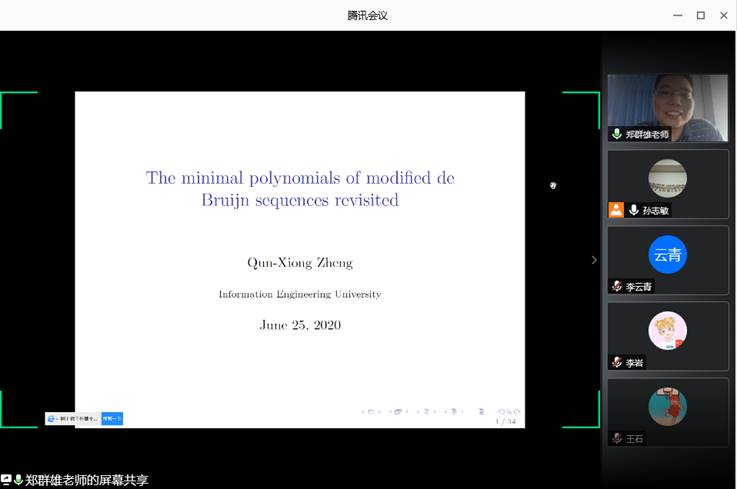 报告题目《The minimal polynomials ofmodified de Bruijn sequences revisited》。郑群雄副教授介绍了在一定的限定条件下,modifiedde Bruijn序列的最小多项式不可能是两个多项式积的形式,并给出这些序列线性复杂度的下界。