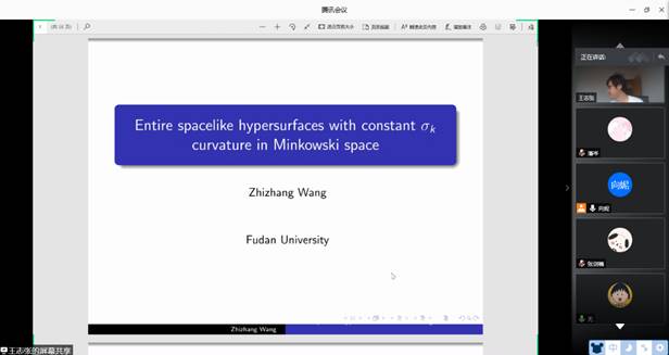 王志张教授报告题目为《Entire spacelike hypersurfaces with constant σk curvature in Minkowski space》,报告中证明了Minkowski空间中光滑严格凸且类空具有常σk曲率和指定类光方向的超曲面的存在性。