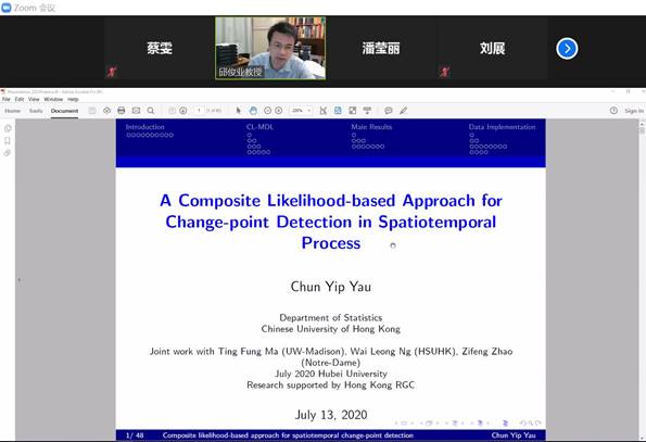 2020年7月13日上午11点,香港中文大学统计系邱俊业教授应我院刘展教授邀请,为我院师生作线上学术报告。报告通过zoom会议在线举行,由刘展教授主持,来自应用统计学专业的教师、硕士研究生等23人参与了报告的听取与讨论。