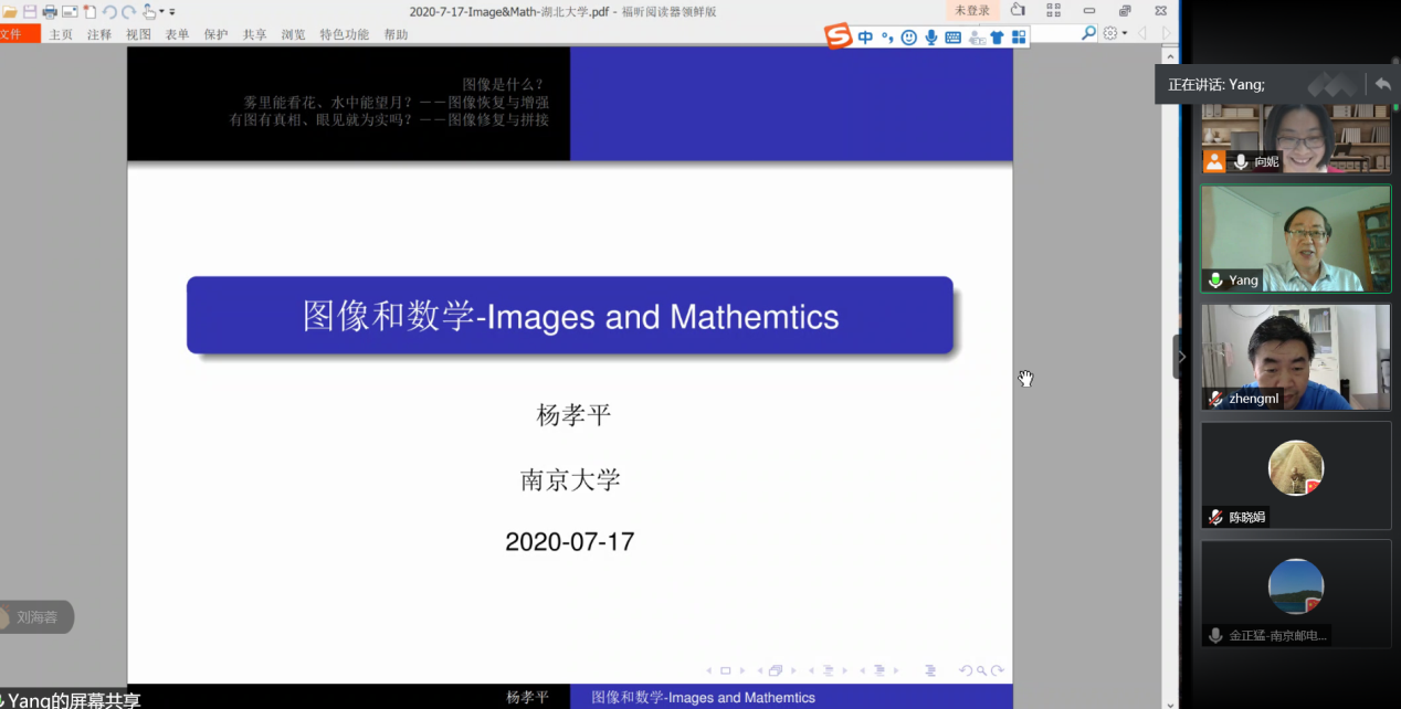杨孝平教授报告的题目为《图像和数学-Images and Mathemtics》,这次报告主要分三个模块介绍了图像是什么、图像的恢复与增强以及图像的修复与拼接。