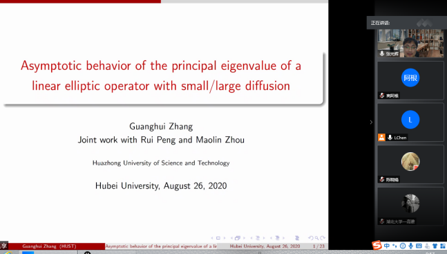 2020年8月26日上午,华中科技大学张光辉教授应我院陈立老师邀请,作线上学术报告。报告通过腾讯会议举行,来自我院几何与分析团队的教师、研究生10余人参与了报告的听取和讨论。