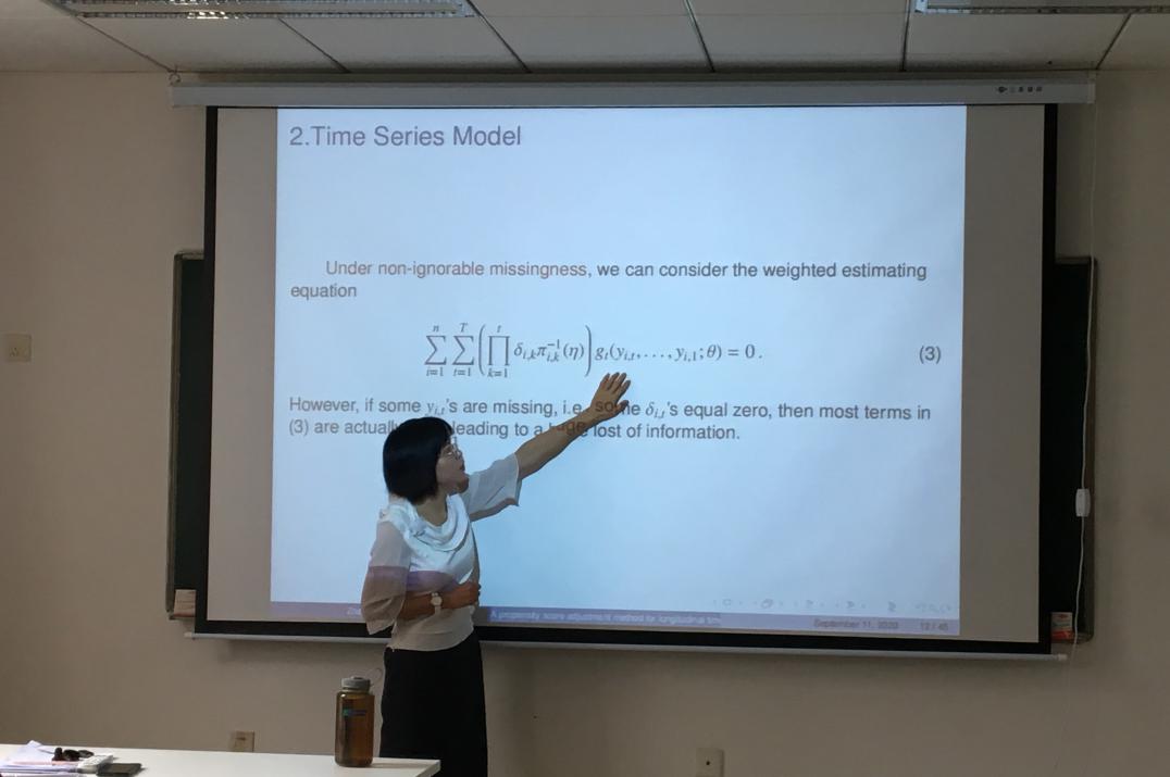 刘展教授报告题目为《A propensity score adjustment method for longitudinal time series models under nonignorable nonresponse》,刘展教授介绍了在实际纵向调查中存在不可忽略的缺失数据时,应该如何对时间序列的缺失数据进行处理。通过建立纵向时间序列模型,提出倾向得分加权的估计方程来估计模型参数,其中估计方程是基于序列成对似然函数的思想来构造,倾向得分的估计通过求解平均得分方程来求解,最后证明了参数估计的相合性与渐近正态性,并提出了参数估计的方差估计,模拟与实证结果证明本文提出的方法与传统方法相比效果更好。