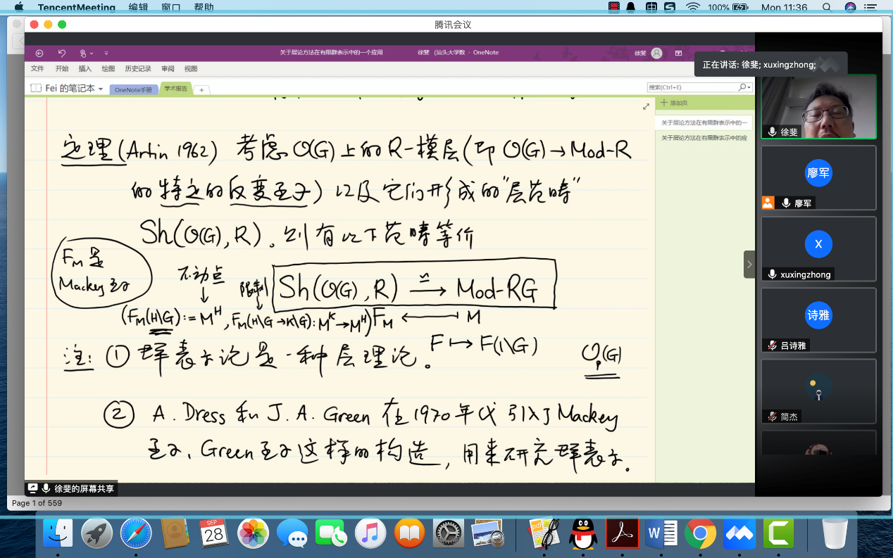 徐教授做了题为“关于层论方法在有限群表示中的一个应用”的报告,首先给出一些关于群表示与上同调中存在的各类范畴(如G-集合范畴、轨道范畴、传输范畴、融合系等)的介绍,考虑这些范畴上的Grothendieck拓扑,进而给出相应的层范畴的介绍。然后徐教授通过一个经典的结果,即群表示等价于轨道范畴上的层,把群表示论和层论联系起来,给出一种以层论方法为框架考察群表示的思路。最后对上述等价关系进行了详细解释,并证明群表示范畴还能嵌入不同的层范畴。