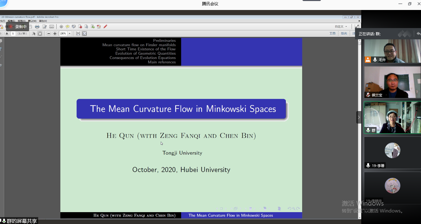 2020年10月16日下午, 同济大学贺群教授应我院毛井教授邀请,作线上学术报告。报告通过腾讯会议在线上举行,由毛井教授主持,来自我院几何团队的教师、研究生10余人参与了报告的听取、讨论。