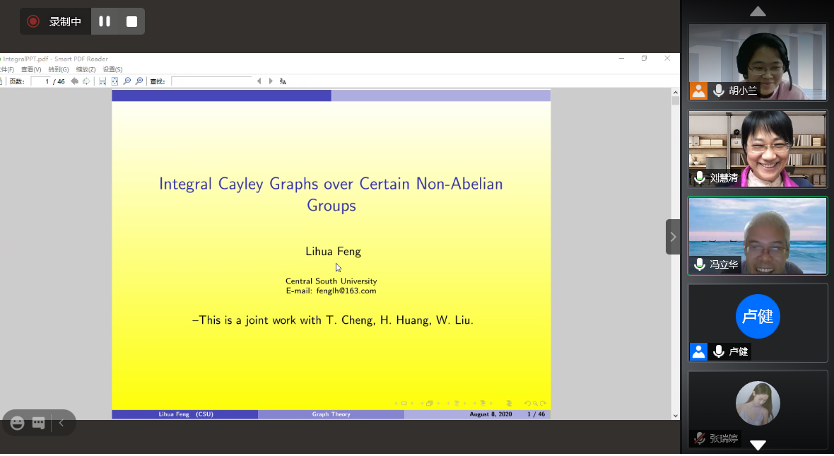 冯立华教授的报告题目是《Integral Cayley Graphs over Certain Non-Abelian Groups》。冯立华教授介绍了凯莱图的整数特征值以及特征标的相关问题。报告十分精彩,老师和同学们对该问题很有兴趣。