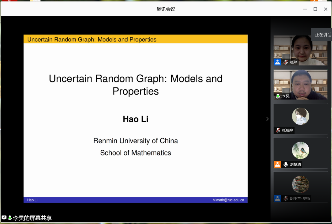 李昊老师的报告题目是《Uncertain Random Graph: Models and Properties》,李昊老师从基础的概念开始讲,并结合了今年的新冠疫情进行展开。报告十分精彩,老师和同学们对该问题很有兴趣。