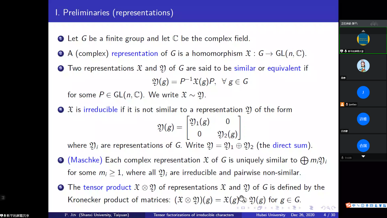 2020年12月26日,山西大学三位群论专家靳平教授、常学武副教授、常慧敏讲师应我院廖军副教授邀请,为我院作线上学术报告。会议由刘合国教授主持,来自群论相关专业的教师、博士和硕士研究生参与了报告的听取、讨论。