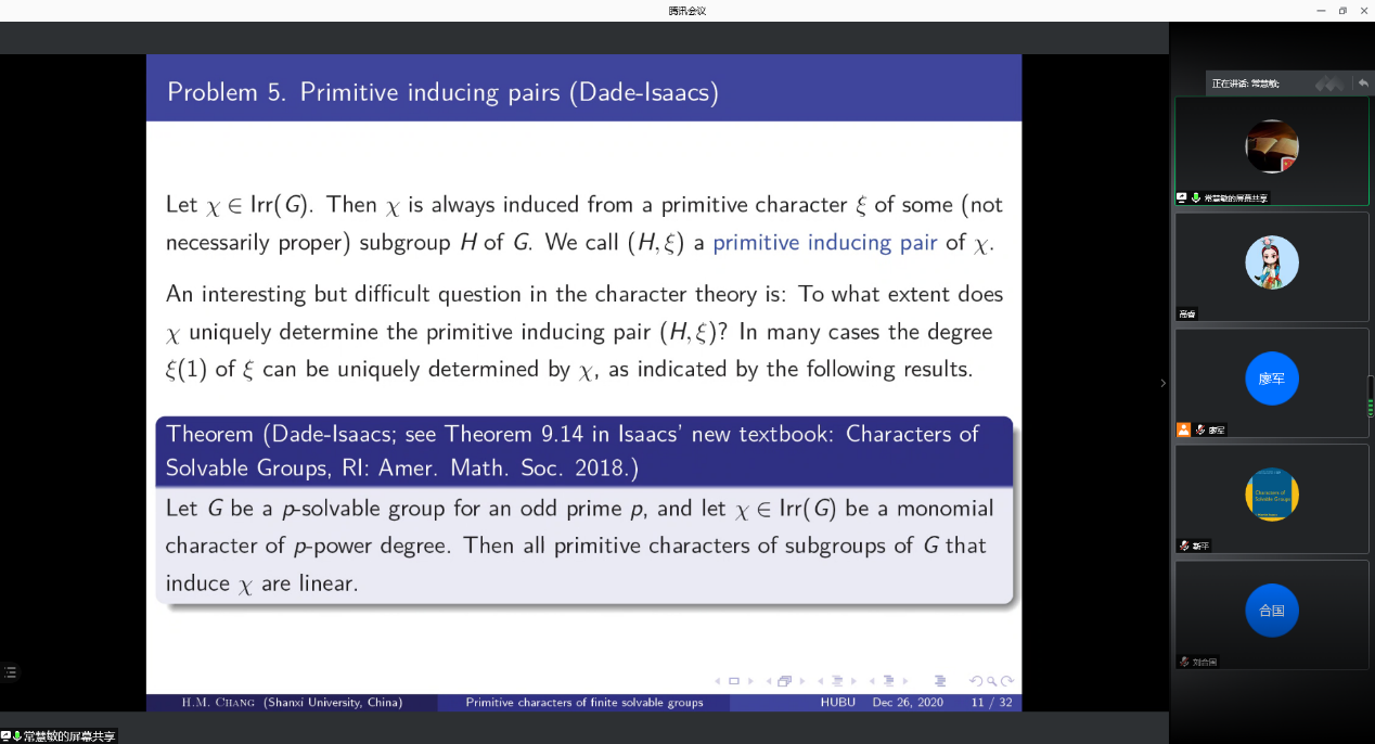常慧敏讲师做了题为“Primitive characters of finite solvable groups”的报告,主要讨论了有限可解群的本原性问题,包括本原性的零和值,置换公式和因式的存在性,以及本原归纳对的唯一性。