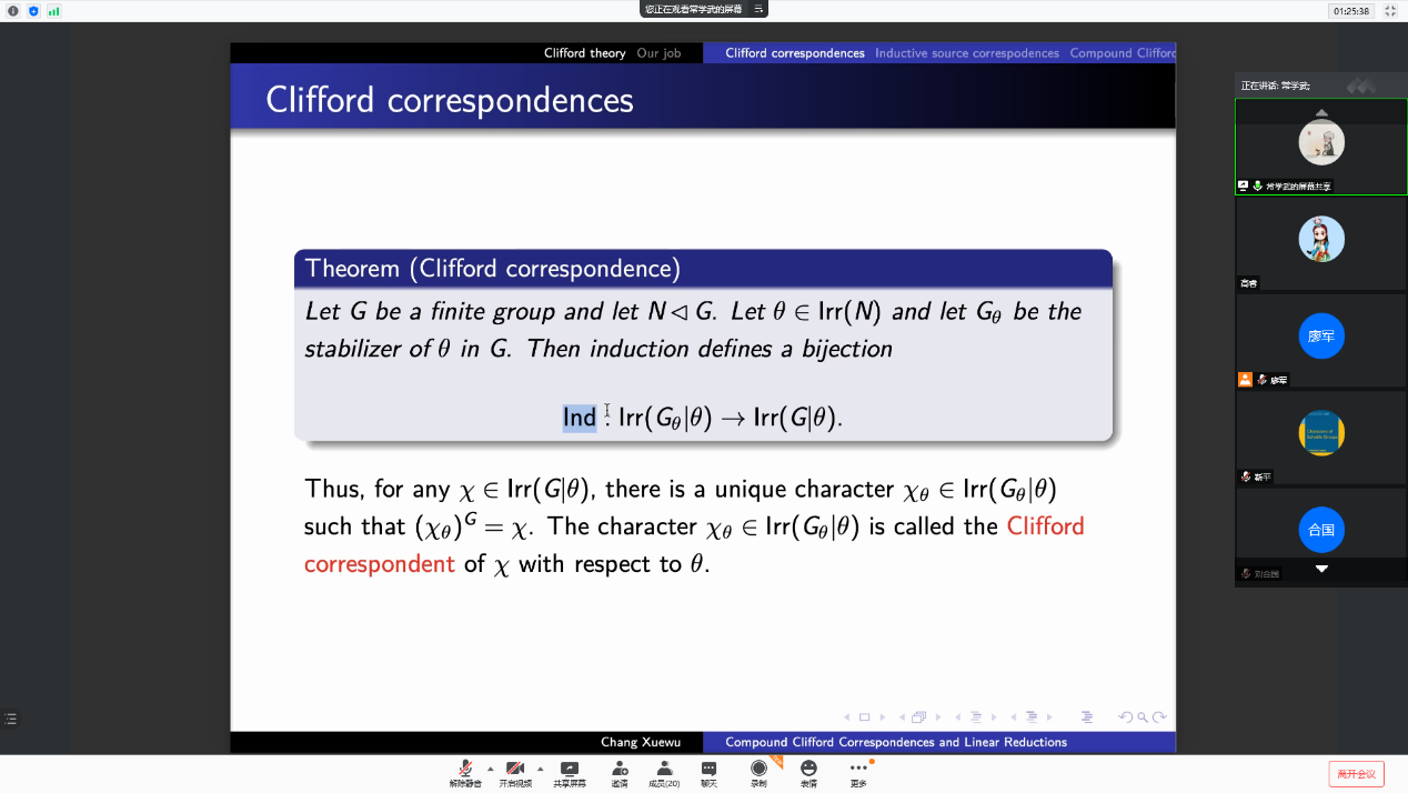 常学武副教授做了题为“Compound Clifford Correspondences and Linear Reductions”的报告,对20世纪80年代由E.C. Dade和I. Isaacs开创的复合Clifford对应和线性约化进行综述。引入拟合子组的概念,并得到一个特征子组的结构定理。特别地,证明了如果一个三元组没有幂零线性极限,那么这个三元组的线性极限包含一个各向异性控制的特征5(在Issacs的意义上),并给出了一些应用。