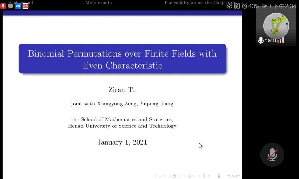 李春雷教授报告《Linear Codes from Two-to-One Functions》,报告首先介绍了线性码的一般构造方法,然后重点介绍了基于2-to-1函数的线性码构造,最后提出了关于这方面研究的一些开放性问题。涂自然副教授报告《Binomial Permutations over Finite Fields with Even Characteristic》,报告详细介绍了其关于偶特征有限域上二项式置换方面的研究工作进展。李超云博士后报告《Public Key Cryptography》,报告首先回顾了公钥加密的历史,然后介绍了广泛使用的椭圆曲线密码,最后就包含后量子密码在内的公钥密码进行了探讨。