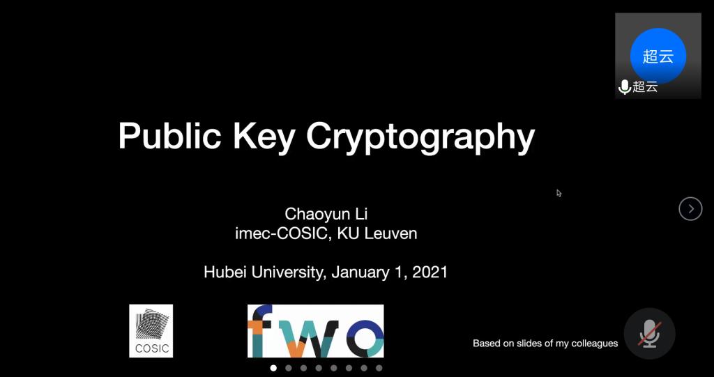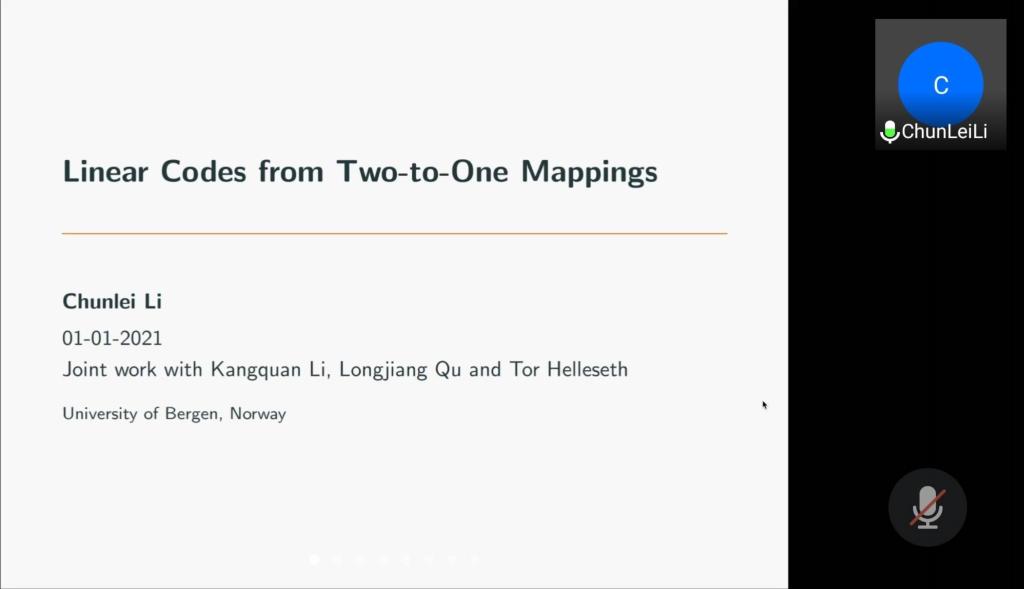 2021年1月1日,时值元旦欢度新年之际,挪威卑尔根大学李春雷教授、河南科技大学凃自然副教授、比利时鲁汶大学博士后李超云应我院密码学团队邀请,为我院带来三场精彩的线上学术报告。报告通过腾讯会议(会议ID:443 202 074)在线举行,会议由张莎莎副教授主持,来自我院密码学团队的教师、研究生20余人参与了报告的听取与讨论。