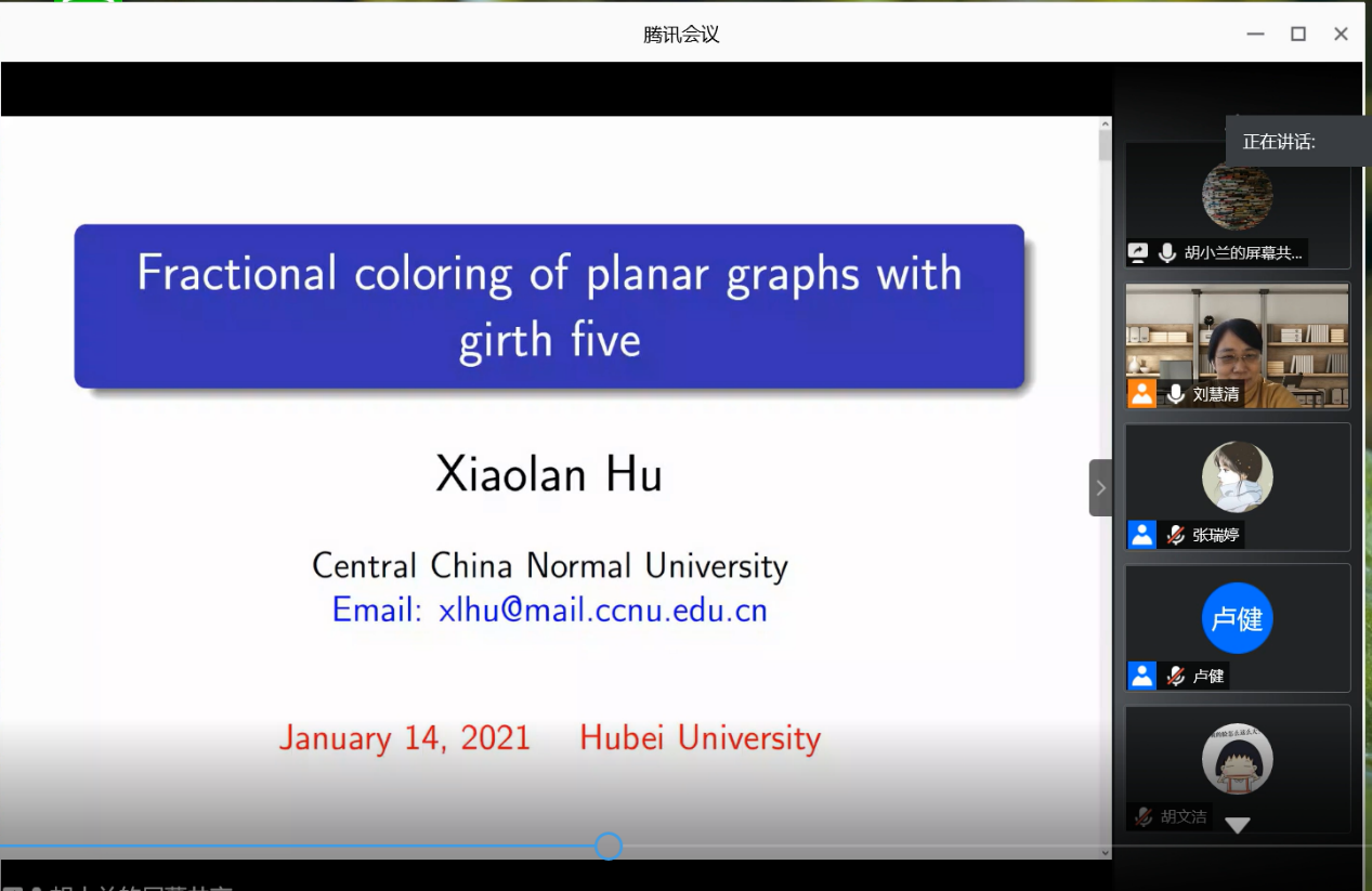 2021年1月14日下午,华中师范大学胡小兰副教授应我院刘慧清教授邀请,为我院师生作线上学术报告,报告通过腾讯会议在线举行。会议由刘慧清教授主持,来自运筹学与控制论专业的教师、博士和硕士研究生参与了报告的听取、讨论。