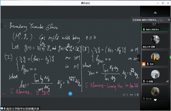 报告中,陈学长教授介绍了关于边界Yamabe流的背景知识和已有的相关结论,详细地讲解了其与合作者现有的研究进展,并就相关理论能否推广到其他边界条件上与参会师生进行了讨论。与会师生通过此次讲座,对紧流形上的纯量曲率和边界曲率流问题有了一定的认识,丰富了自身的知识。