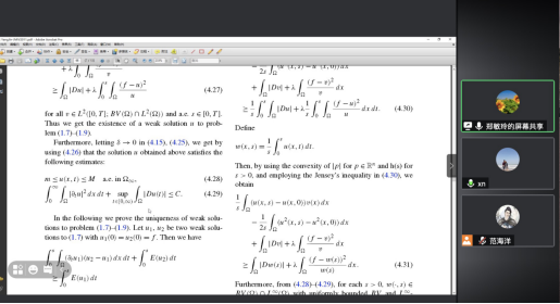 报告中,郑敏玲教授回顾了该方程相关的背景,并介绍了其在图像处理中的应用。报告结束后,郑敏玲教授详细解答了师生的问题并展开深入的讨论交流,与会师生均表示受益匪浅。