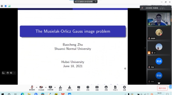 2021年6月18日下午,陕西师范大学朱保成教授应我院向妮教授邀请,为几何团队师生作了题为“The Musielak-Orlicz Gauss image problem”的线上学术报告。