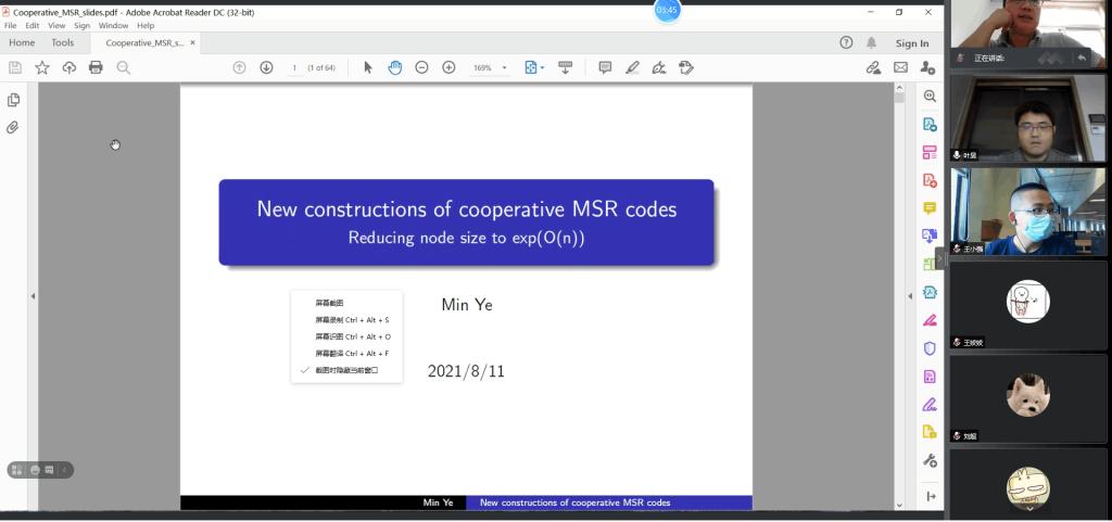 报告中,叶旻教授首先介绍了了分布式存储系统中的单个或多节点最优修复问题。在此基础上,介绍了在合作式修复模型下,对所有可能参数具有最优修复带宽的MDS码明确构造的最新研究成果,该成果大大降低了子包集的大小。报告结束后,对分布式存储编码相关问题展开了热烈讨论,大家都表示受益匪浅。