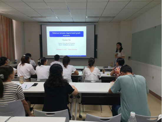 2021年9月17日下午,华中师范大学胡小兰副教授应邀来访我院,在院203报告厅为学院师生做了题为“ Relation between degree-based graph invariants ”的学术报告,报告由学院的刘慧清教授主持。来自运筹学与控制论专业的教师、博士和硕士研究生参加了本次学术报告。