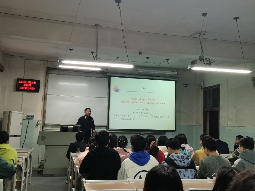 2021年11月25日下午15:30,安徽大学高文武教授应邀在教2-104为我院应用数学及应用统计方向师生作了题为“Quasi-interpolation for high-dimensional function approximation”的学术报告。