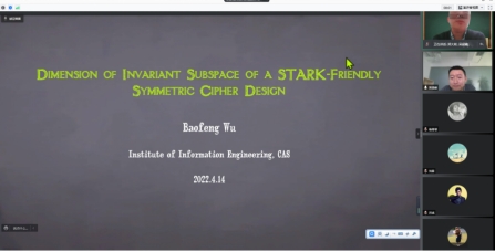 2022年4月14日下午,中科院信息工程研究所吴保峰副研究员应邀为我院师生于腾讯会议作了题为《Dimension of invariant subspace of a Stark-friendly symmetric cipher design》的学术报告。