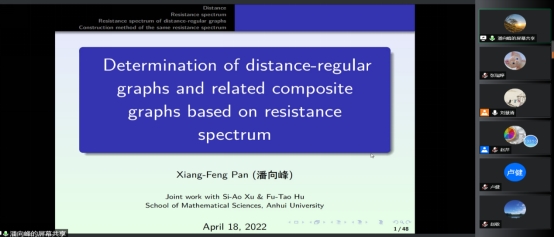 潘向峰老师的报告题目是《Determination of distance-regular graphs and related composite graphs based onresistance spectrum》, 潘向峰老师首先向大家介绍了报告相关的概念以及研究背景,接着就向大家报告了他们团队对于距离正则图和组合图基于距离谱的判定的研究成果。