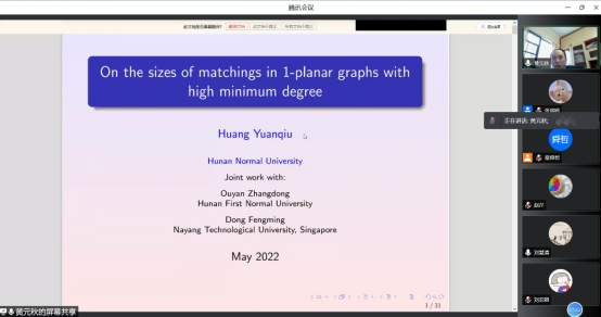 黄元秋教授的报告题目是《On the size of matchings in 1-planar graphs with high minimum degree》,黄元秋老师首先向大家介绍了报告相关的概念以及研究背景,接着就向大家报告了他们团队对于具有high的最小度的1-平面的匹配问题的研究成果。