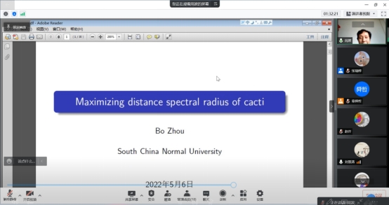周波教授的报告题目是《Maximizing distance spectral radius of cacti》, 周波老师首先向大家介绍了报告相关的概念以及研究背景,接着就向大家报告了他们团队关于仙人掌图中最大的距离谱半径的研究成果。