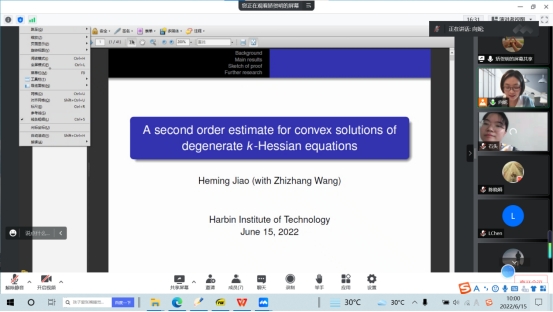2022年6月15日上午,哈尔滨工业大学矫贺明教授应我院向妮老师邀请,为几何团队师生作了题为“A second order estimate for convex solutions of degenerate k-Hessian equations”的线上学术报告。