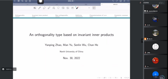 2022年11月30日上午,中北大学吴森林教授为我院师生作了题为《An orthogonality type based on invariant inner products》的学术报告。