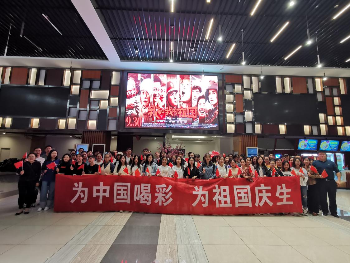 活动开始,全体师生代表站在《我和我的祖国》电影屏幕前共同合影。合影结束后,全体人员一同进入观影厅进行观影。电影结束后,每个人脸上都洋溢着对祖国的骄傲自豪之情,有些同志红了眼眶,还有同志坐在座位上久久不愿离去。