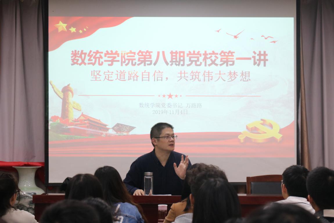 开班典礼结束后,万书记为入党积极分子带来了党课的第一讲——坚定道路自信,共筑伟大梦想。通过引入四个自信,重点讲述道路自信的实践过程与总结和反思。在讲课中,万书记为入党积极分子们解读了中国特色社会主义道路的形成、内容及其意义。相信第八批入党积极分子通过这次党课的学习,进一步提升自己的素养,学习好党员基础理论知识并身体力行,为早日成为一名正式的党员走出更为踏实的一步。