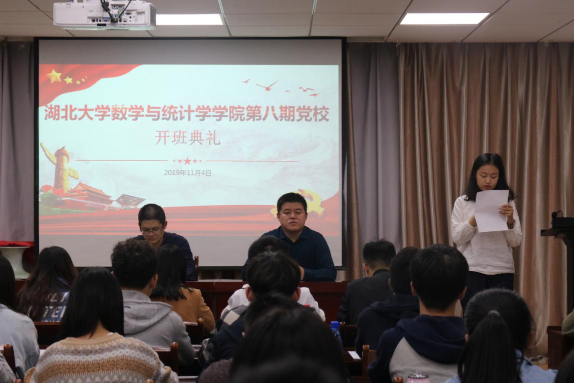 数统学院学生团委副书记侯文慧宣读党校培训纪律要求。数学与应用数学2018级李天琪同学代表入党积极分子讲话。