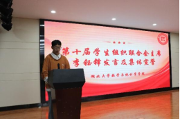 第十届学联会主席李钰铎发言,表明接下来的工作计划及决心:一是明确定位,健全机制;二是加强沟通,凝心聚力;三是弘扬传统,开拓创新。希望每一位同学脚踏实地,团结一致,勤思考,肯努力,共同书写学联会新的篇章,并带领第十届学联会全体成员、现任班长及团支书集体宣誓《学生干部自律公约》。