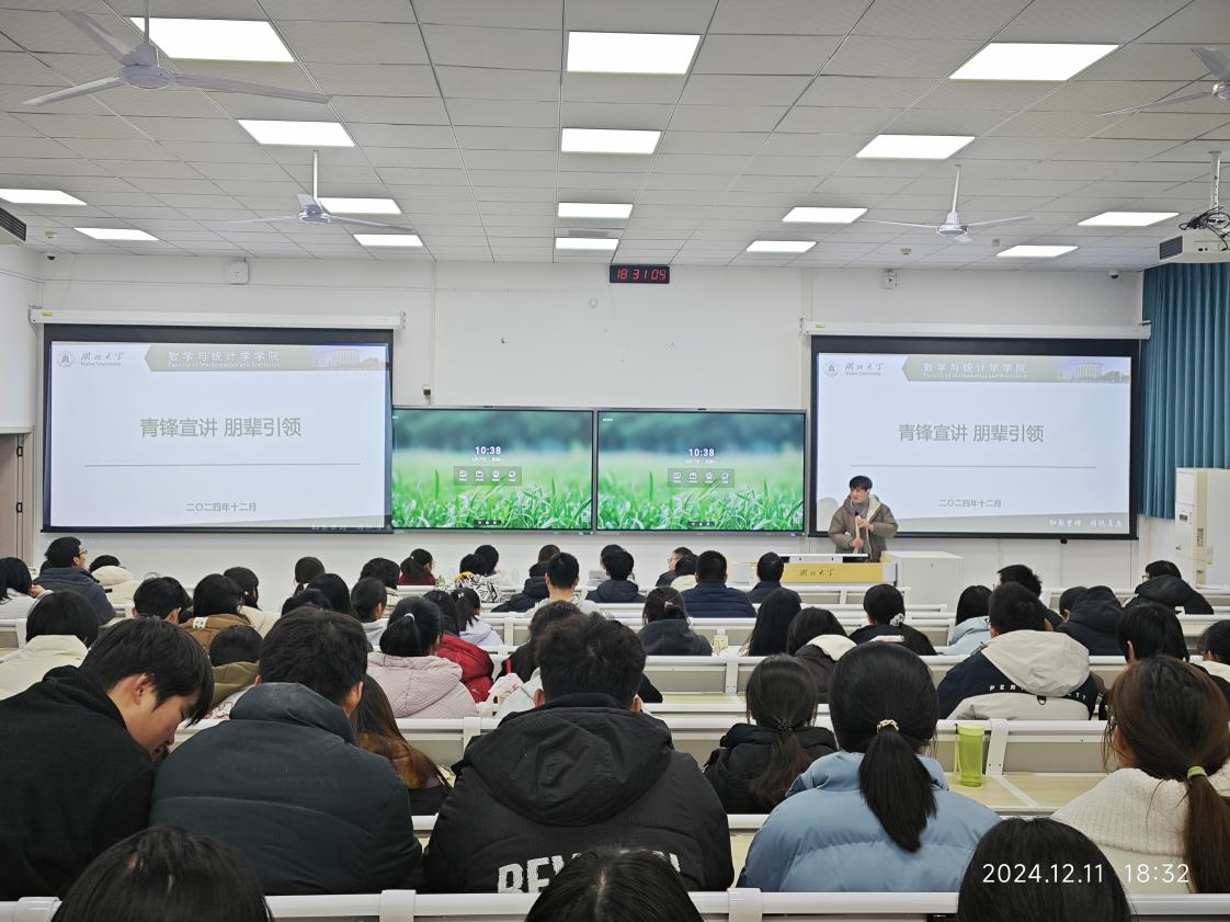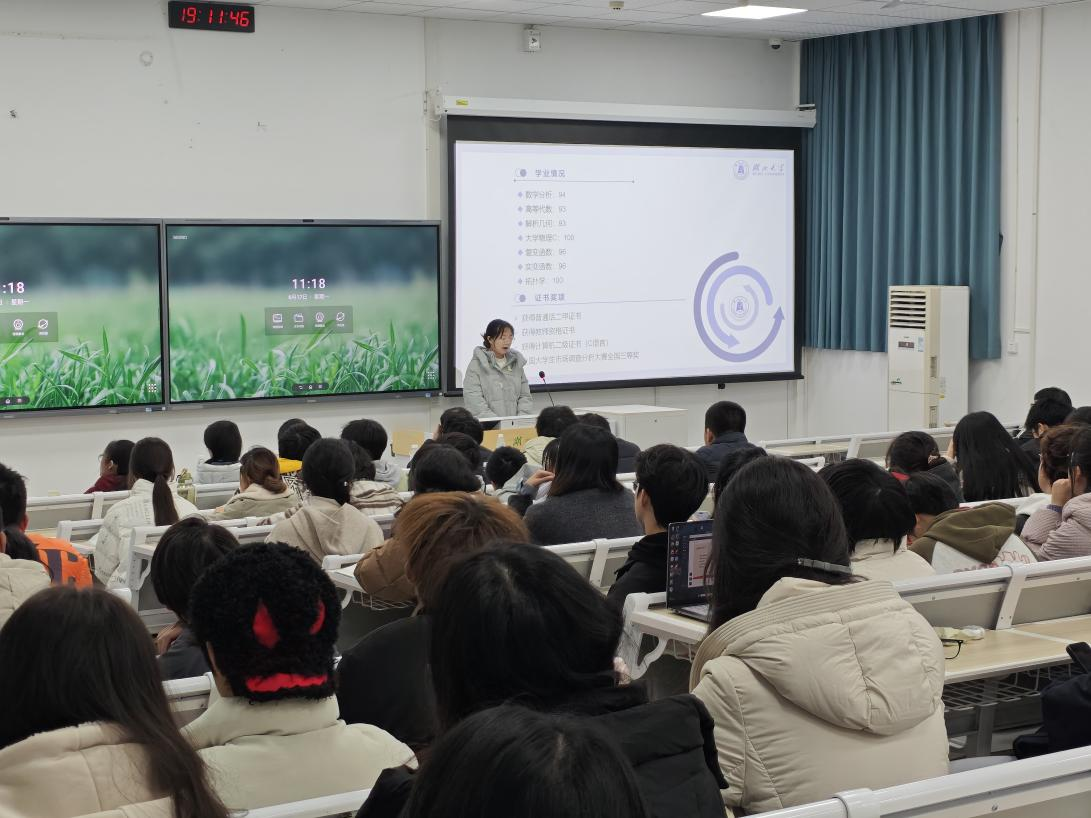 12月11日晚,学院在阳逻校区B312教室举办朋辈交流分享活动,邀请青锋宣讲团优秀成员代表分享了学习经验,并开展学风建设座谈会。学院党委副书记王文锋、辅导员杜强、易志奇,青锋宣讲团成员代表以及2024级数学类新生参与此次活动,会议由易志奇主持。