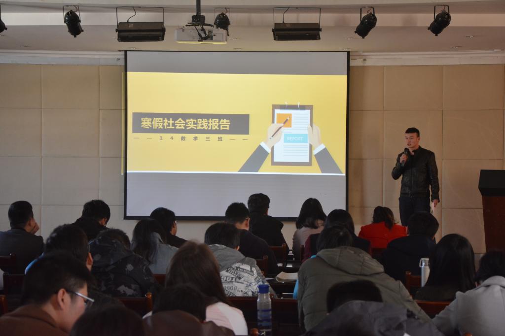 报告会以团支部为单位收集整理学生上交的社会实践报告,并由各团支部做总结报告。报告会由吕杰锴主持,他以风趣的语言介绍了此次寒假社会实践的主要内容。各团支部上交的社会实践报告内容主要有家乡变化,与父母谈心心得,公益活动以及回访母校等。各团支部报告风格迥然不同,15信科1班团支部由具演讲比赛经验的团支书喻程来做报告,她以激昂语调和绘声绘色的描述展现了15级信科1班团支部寒假社会实践报告的多样性,精心设计并制作了实践日历也为展示添色不少;14数学1班团支部精心制作的ppt让许多学生评委惊叹。