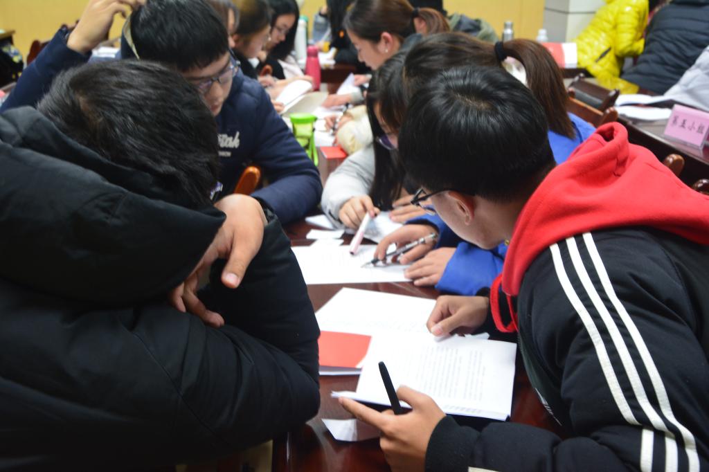 活动最初签到时,大家自主抽签,组成了临时的学习小组,共8组。全体成员佩戴好团徽,在工作人员的引导下主动将手机放进信封。会议活动伊始,全体起立走唱团歌。由主持人简单讲解有关改革开放的基本内容后,大家集体观看学习了改革开放为新中国带来的变化。视频中以山东省广饶县为例,使同学们更加直观的了解改革开放的重要作用。